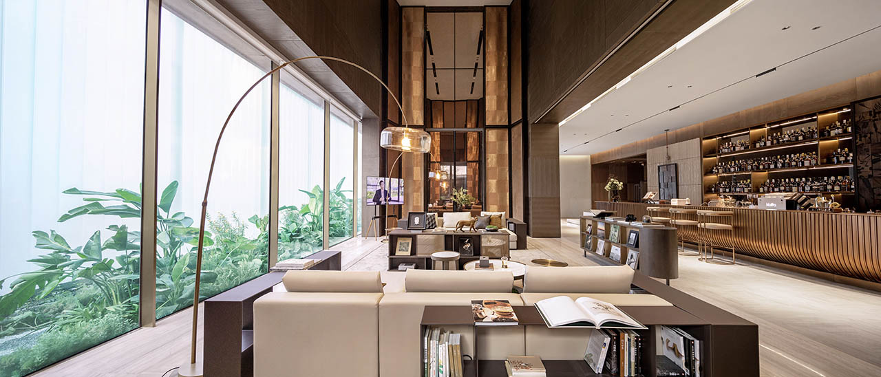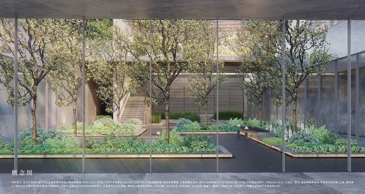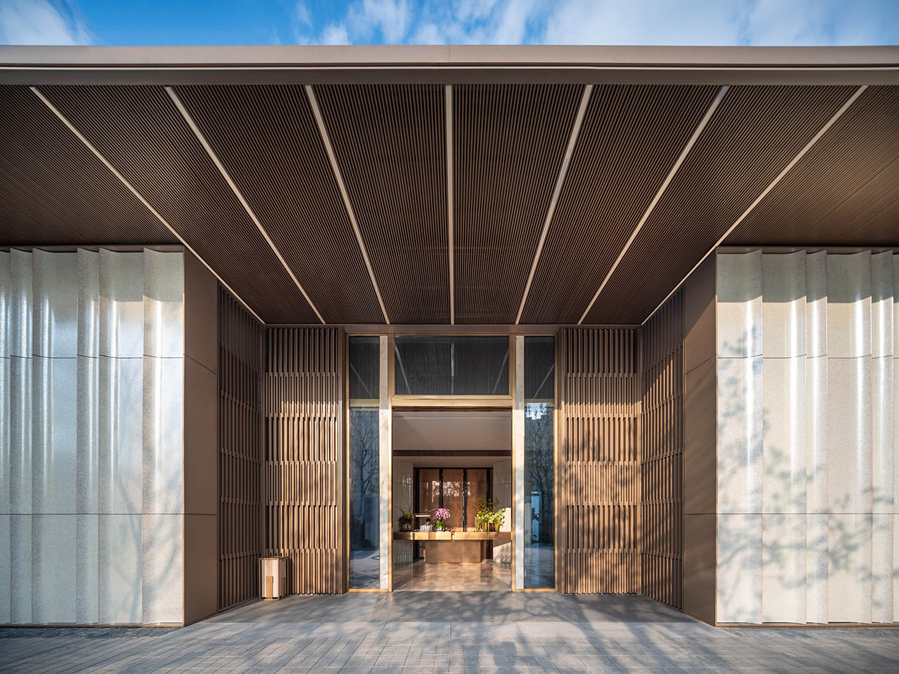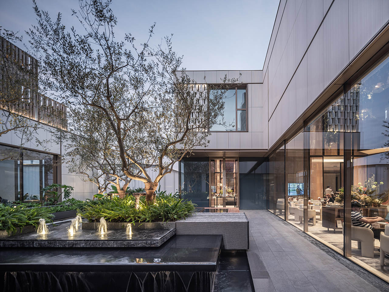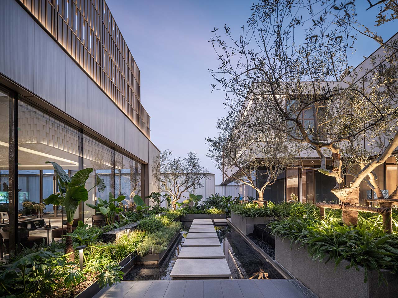 以上海属地元素为灵感,采用轻奢雅致的大理石结合大气线条,将建筑与外部景观无界链接。乌桕林围合出天然的林下会客空间,削弱喧杂的城市环境,营造缓慢而干净的生活场景,丰富的廊架空间,在宁静之中创造纯粹社交的户外空间。