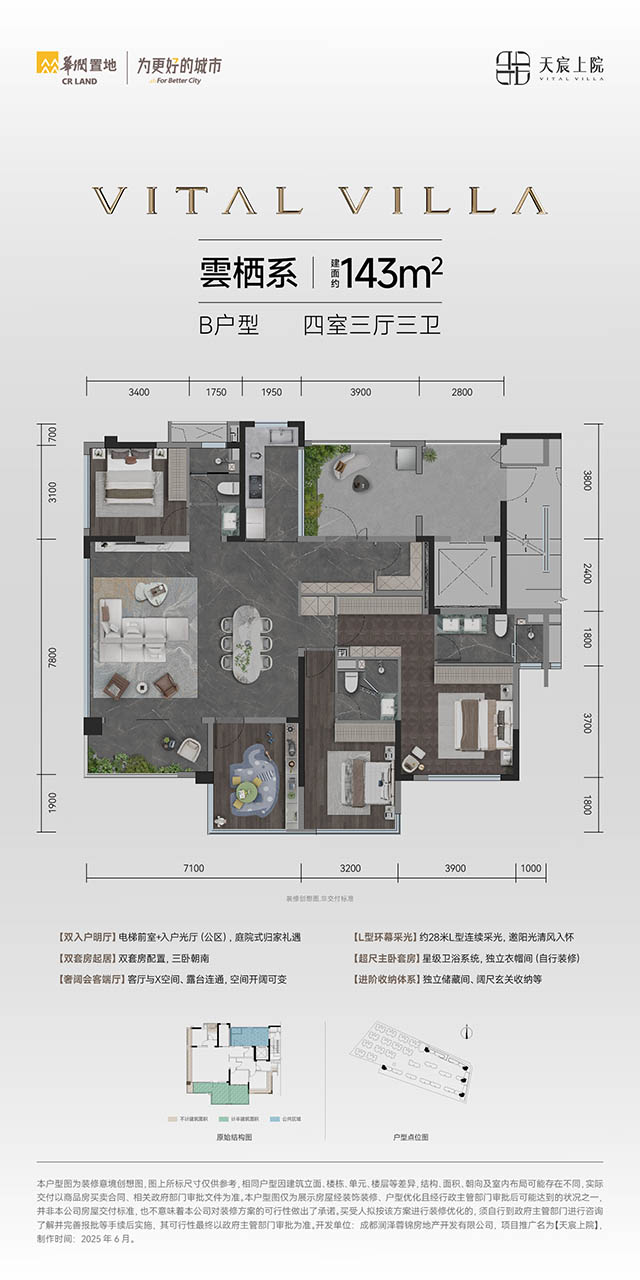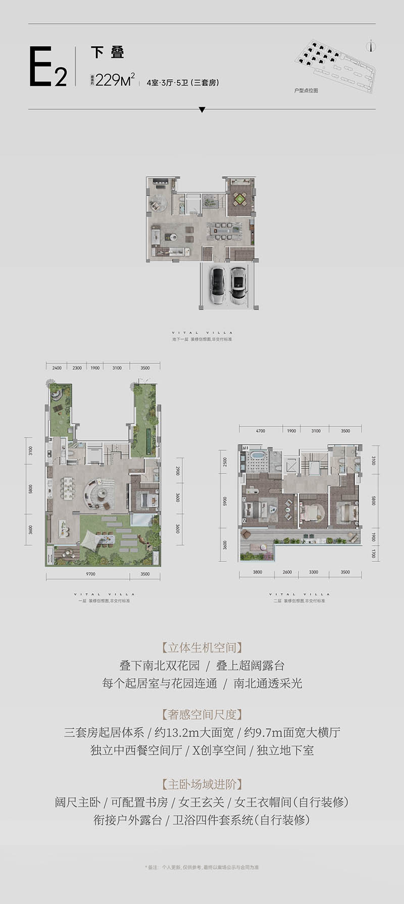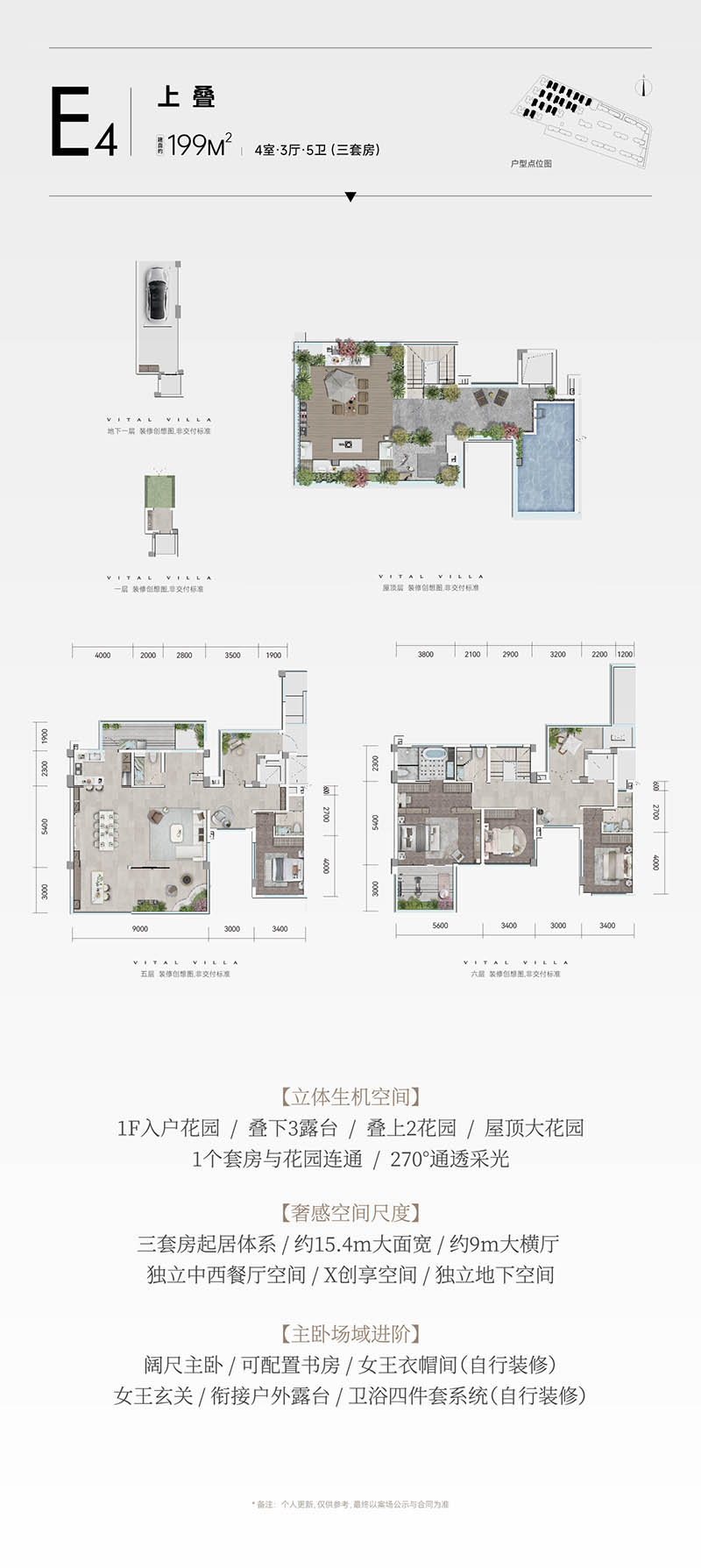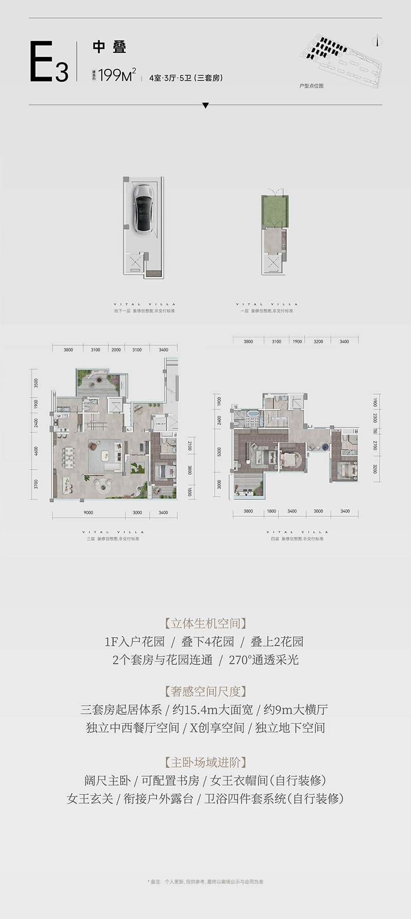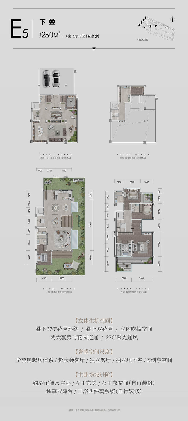 站位万象城东,立于三环内,外部约17亩的市政公园;内部社区多元主题花园中庭;家庭私域多个花园和露台构建的私享空间。园林中布置了红果冬青、朴树、乌桕等名贵树种,水景步道营造出别墅园区的归家仪式感。