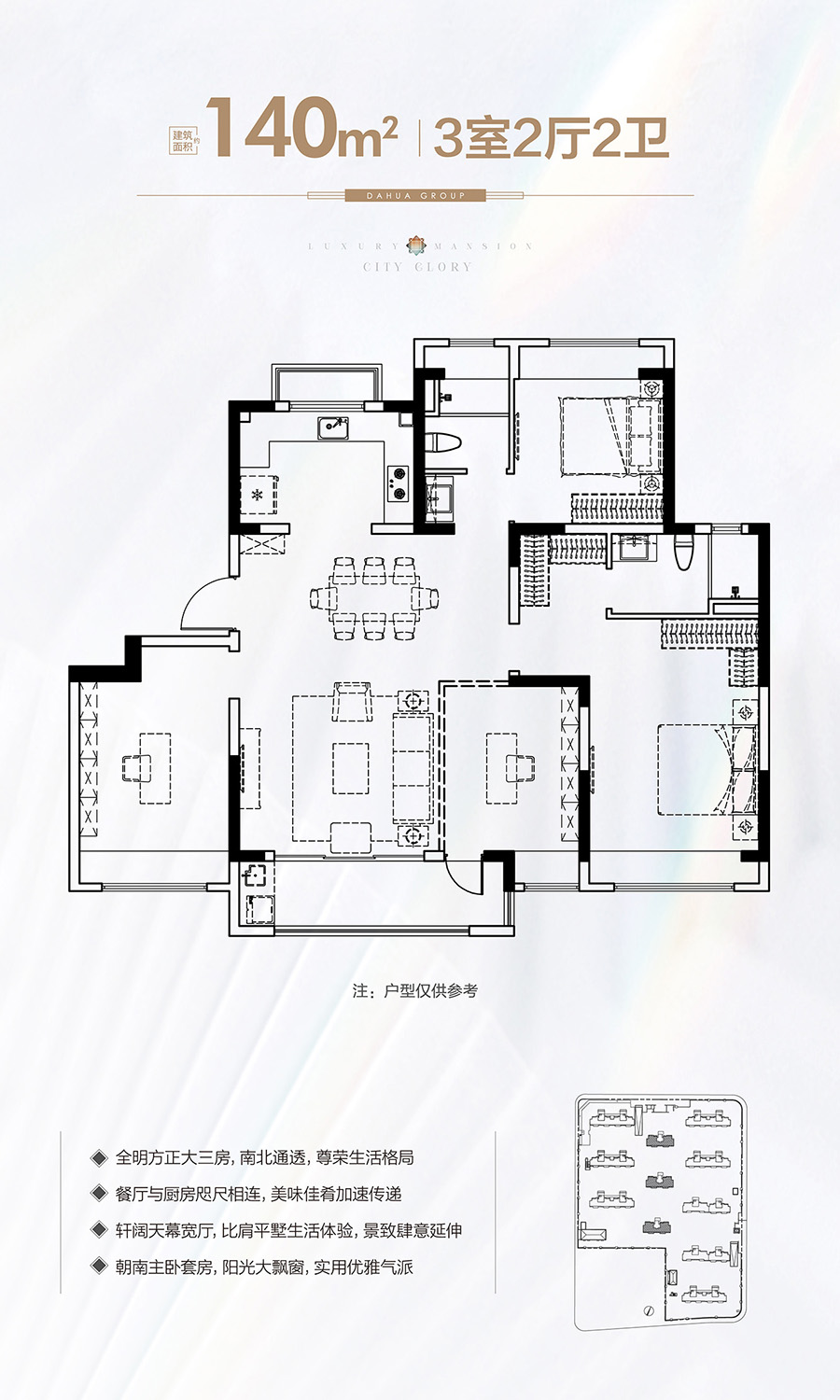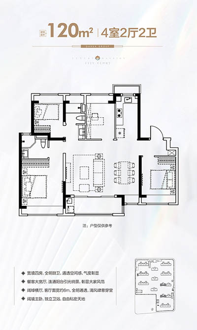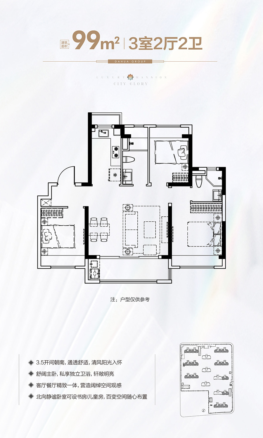 打破户型对生活的限定,成全对生活的热爱。建面约99m²横厅大三房,接纳所有对家的想象,约5.1米阔绰横厅设计,塑造大气观感,带来优秀的采光和通风性,宽境阳台让家人欢聚的时光有阳光与美景相伴,为生活增添乐彩。