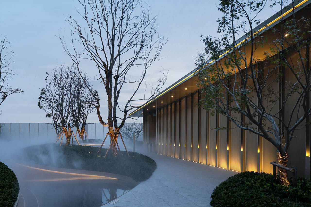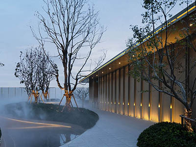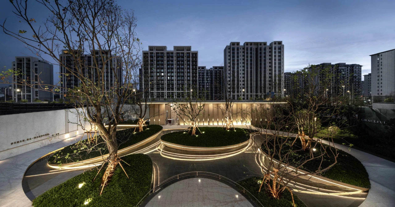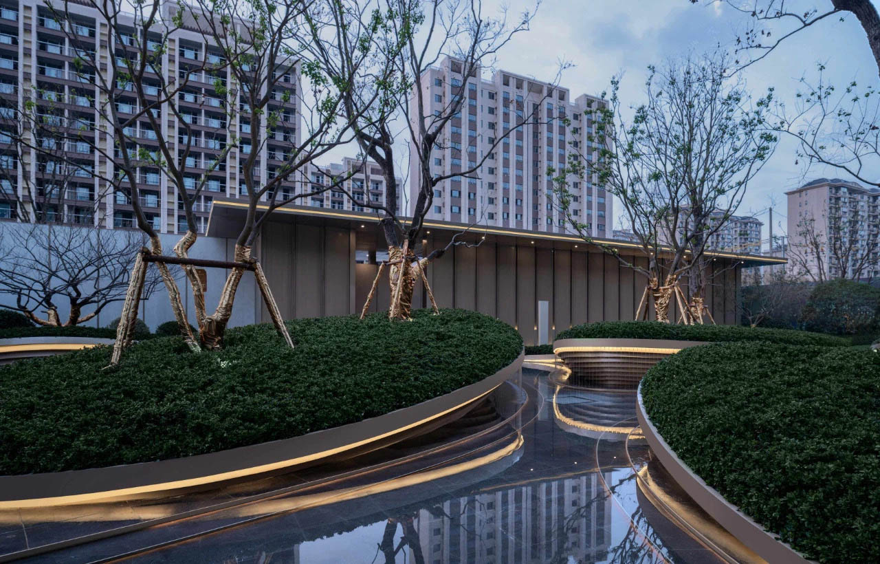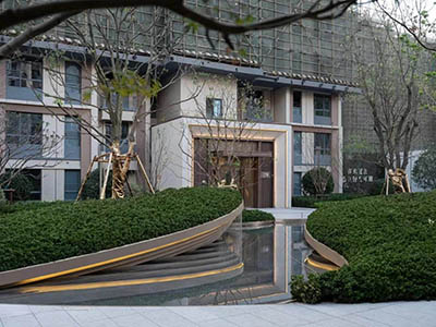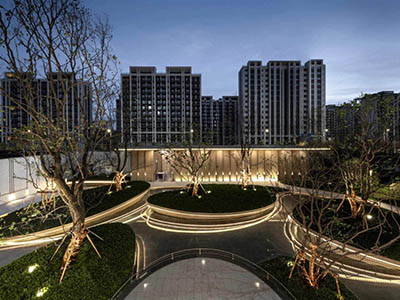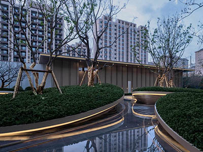 采用东西景观中心绿廊与南北景观步道设计,十字景观轴将小区分为四个组团,以400米长面积约9000㎡的开放式中心绿廊的绿心为中心点,向四个建筑组团中延申设计了四大景观组团:绿丘、绿谷、绿原、绿浪,通过多层次的绿化布置系统,形成立体的绿色生态网络。